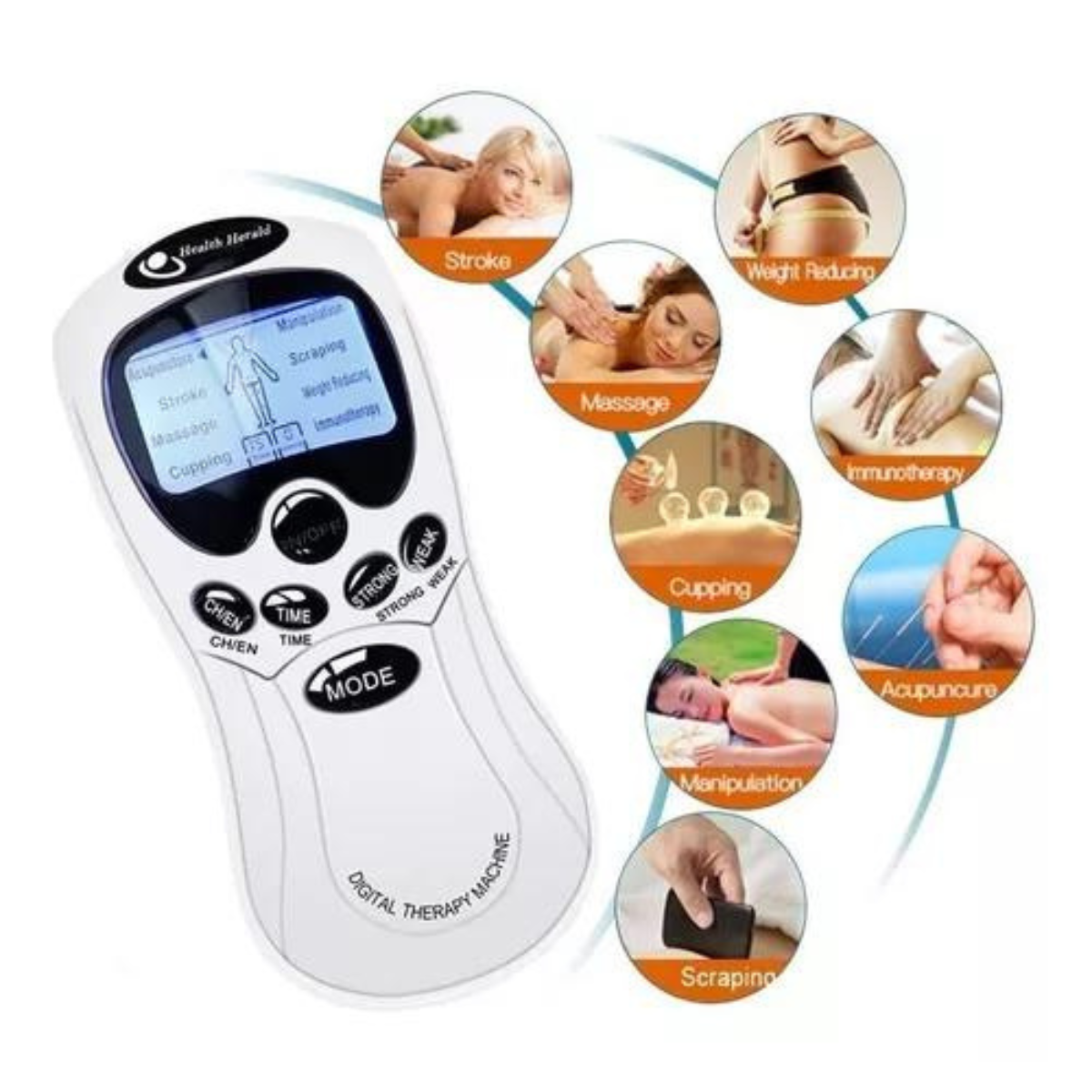 Experimenta un alivio profundo y duradero con nuestro Masajeador Digital Electro Estimulador Muscular Desarrollado por profesionales que utilizan tecnolog as de vanguardia este dispositivo est dise ado para aliviar el dolor reducir el cansancio y mejorar tu bienestar general Descubre c mo la innovaci n se encuentra con el confort en cada uso Alivio Multifuncional Ayuda a aliviar el dolor reduce la fatiga promueve la circulaci n sangu nea recupera el bazo y el est mago mejora la inmunidad o activa la circulaci n para un alivio completo Tecnolog a de Simulaci n Corporal Desarrollado con tecnolog a de simulaci n corporal bi nica bioel ctrica control de microcomputadora inteligente para penetrar de manera m s profunda y efectiva en los grupos musculares Ondas Terap uticas Preestablecidas La unidad env a m ltiples ondas terap uticas el ctricas preestablecidas a trav s de los electrodos estimulando t cnicas de alivio del dolor de tejido profundo y diversos movimientos musculares para aliviar la tensi n muscular Port til Dise o compacto y port til que te permite estimular nervios m sculos relajando tu cuerpo en cualquier momento y en cualquier lugar Uso Vers til Ideal para una amplia gama de aplicaciones desde alivio del dolor hasta mejorar la calidad del sue o Adaptable a tus necesidades para una experiencia personalizada